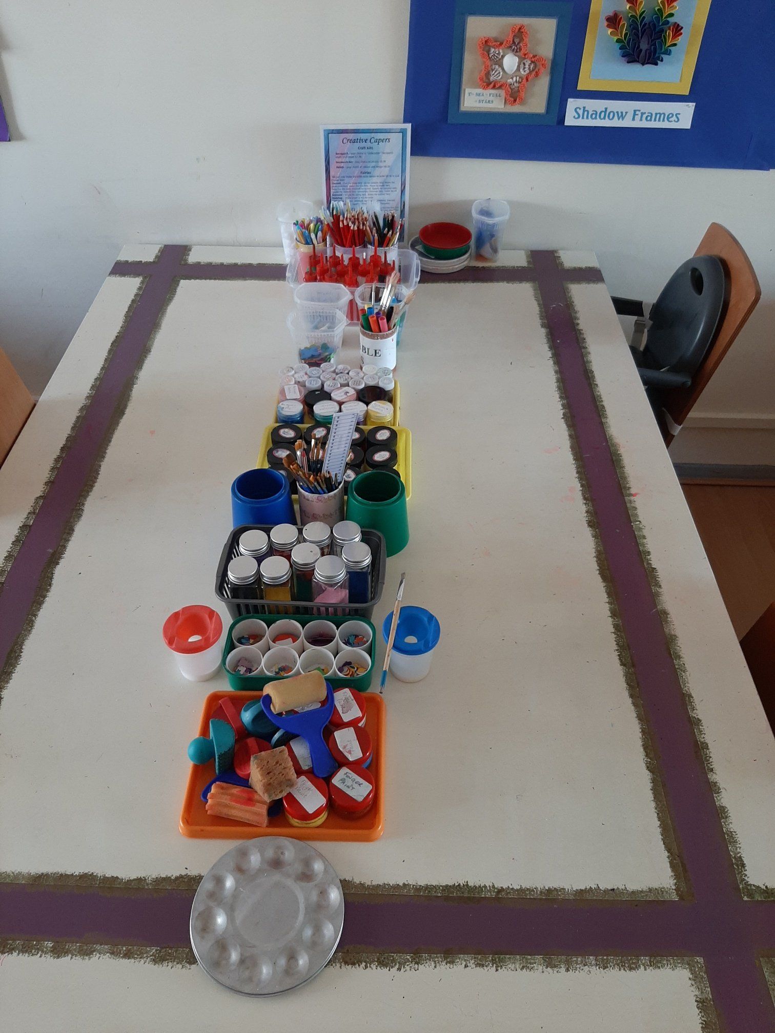 We have a host of materials including acrylic and washable paints, sand, glitter, sequins, feathers, die cuts, felt pens, colouring pencils, stamp pads, stamps and rollers on each table ready to use.